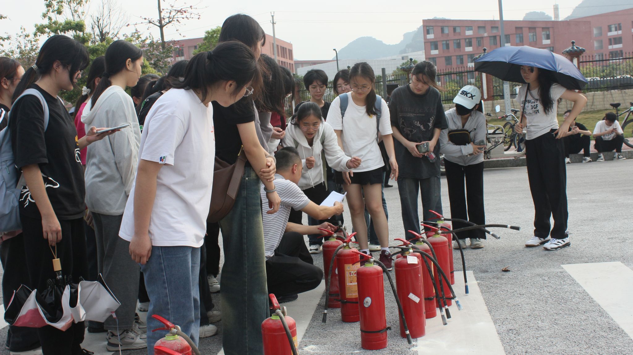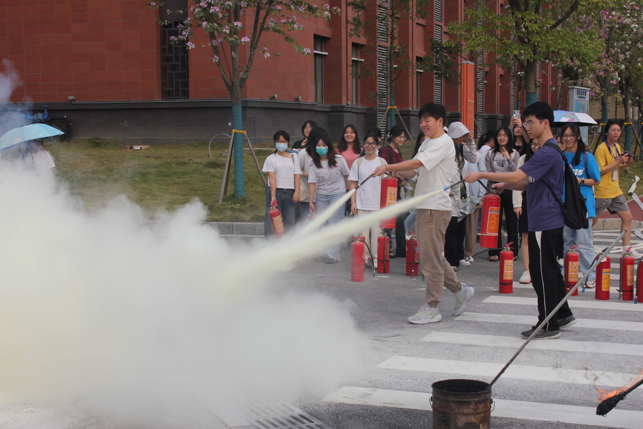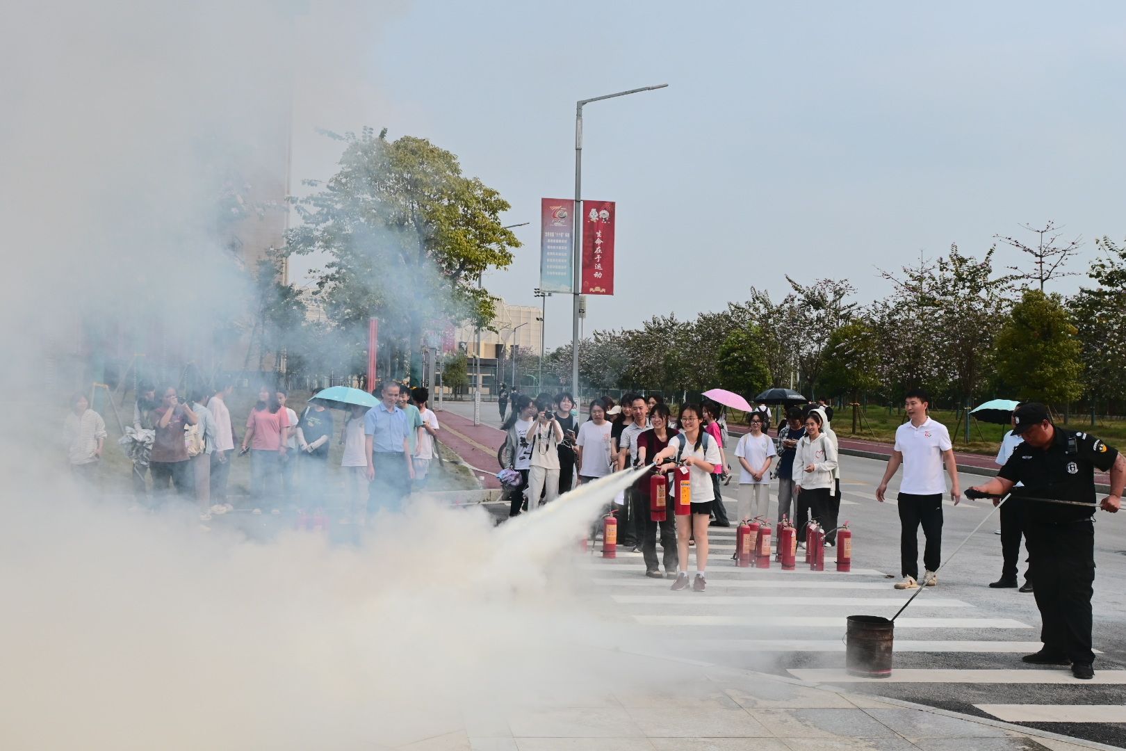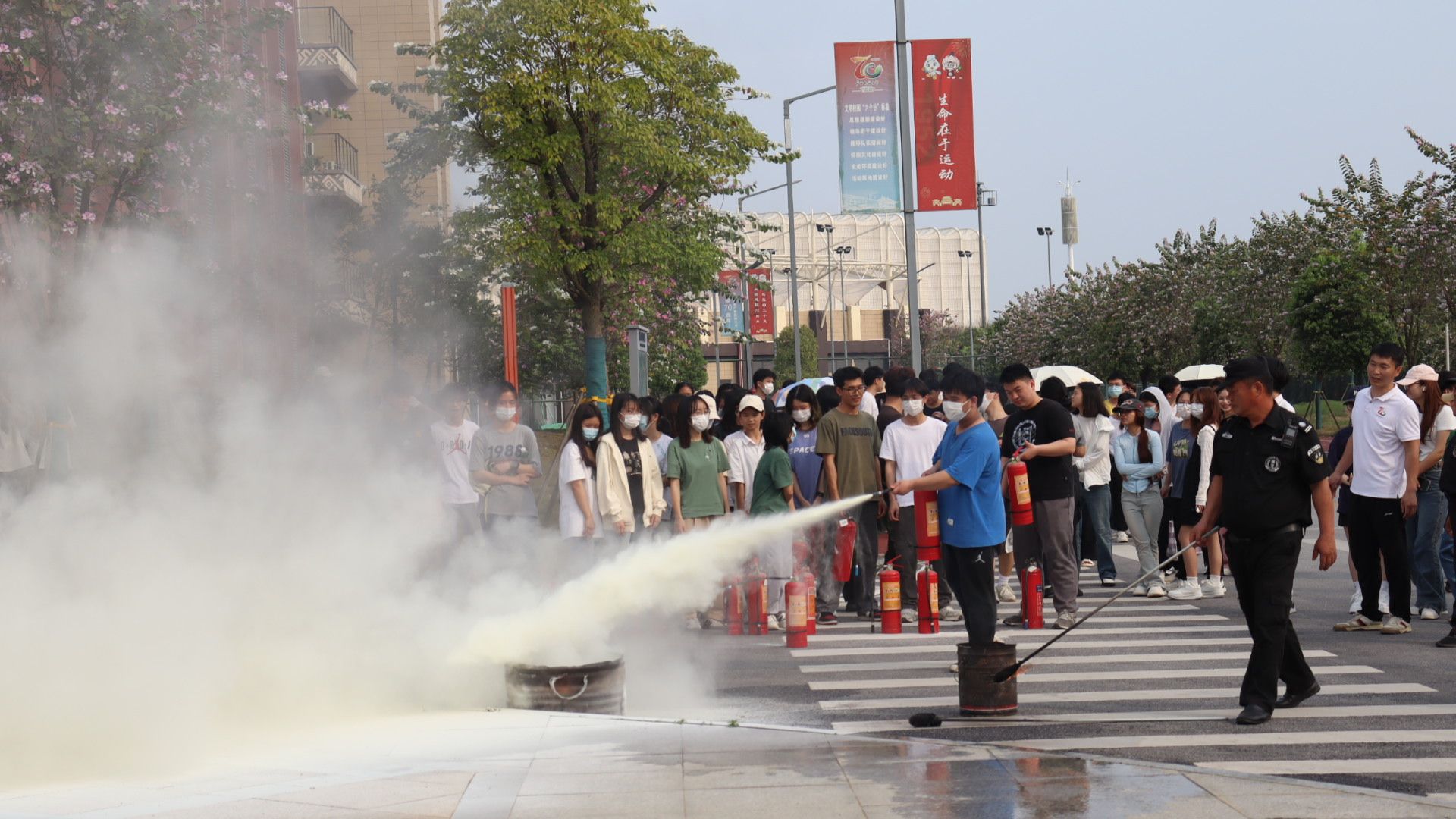 疏散演练结束后,学生集合来到学校正门广场观看灭火实操。保卫处的老师们讲解和示范灭火器的使用方法和注意事项后,同学们积极参与到正确使用灭火器的实操中。参与人员通过轮流操作,最终熟练、正确地使用灭火器,成功扑灭了燃起的大火。