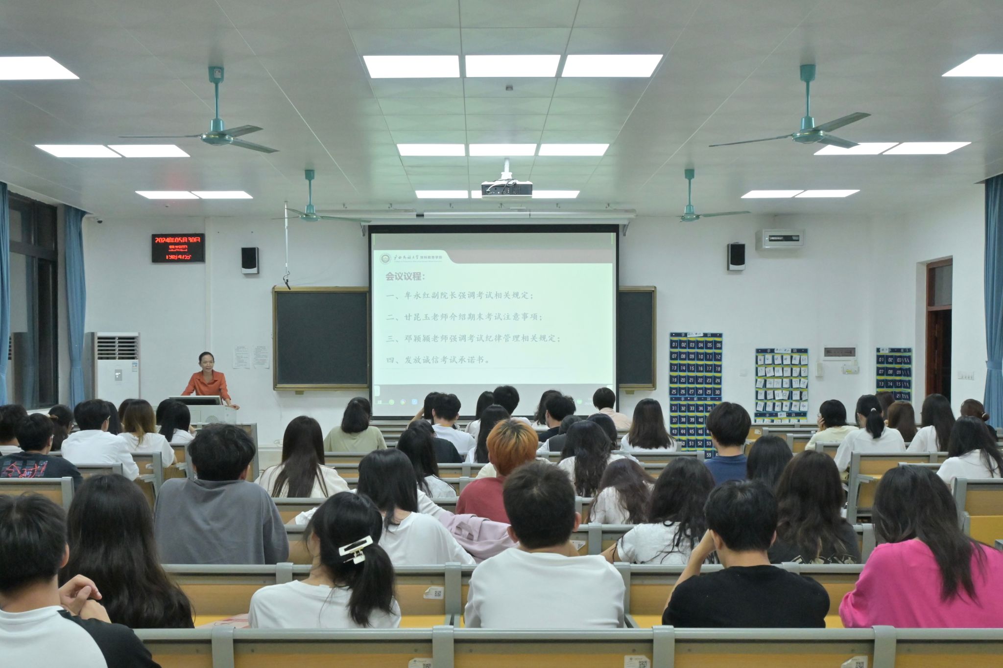 牟永红介绍了考试的相关规定,着重强调诚信考试,呼吁同学们认真备考,自觉遵守考试纪律,共同维护良好考试环境。接着,甘昆玉强调了期末考试流程中需要注意的细则,针对考试过程中可能出现的突发问题,提供了详尽的解答和应对方案。最后,邓颖颍就考试纪律管理相关规定,对期末考试的注意事项和考生守则内容进行宣读,明确指出考试作弊行为的认定标准,阐述了考试作弊的处理方法,并组织同学们签署诚信考试承诺书。