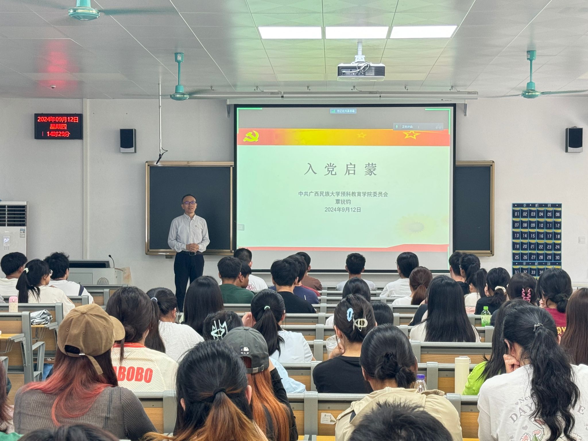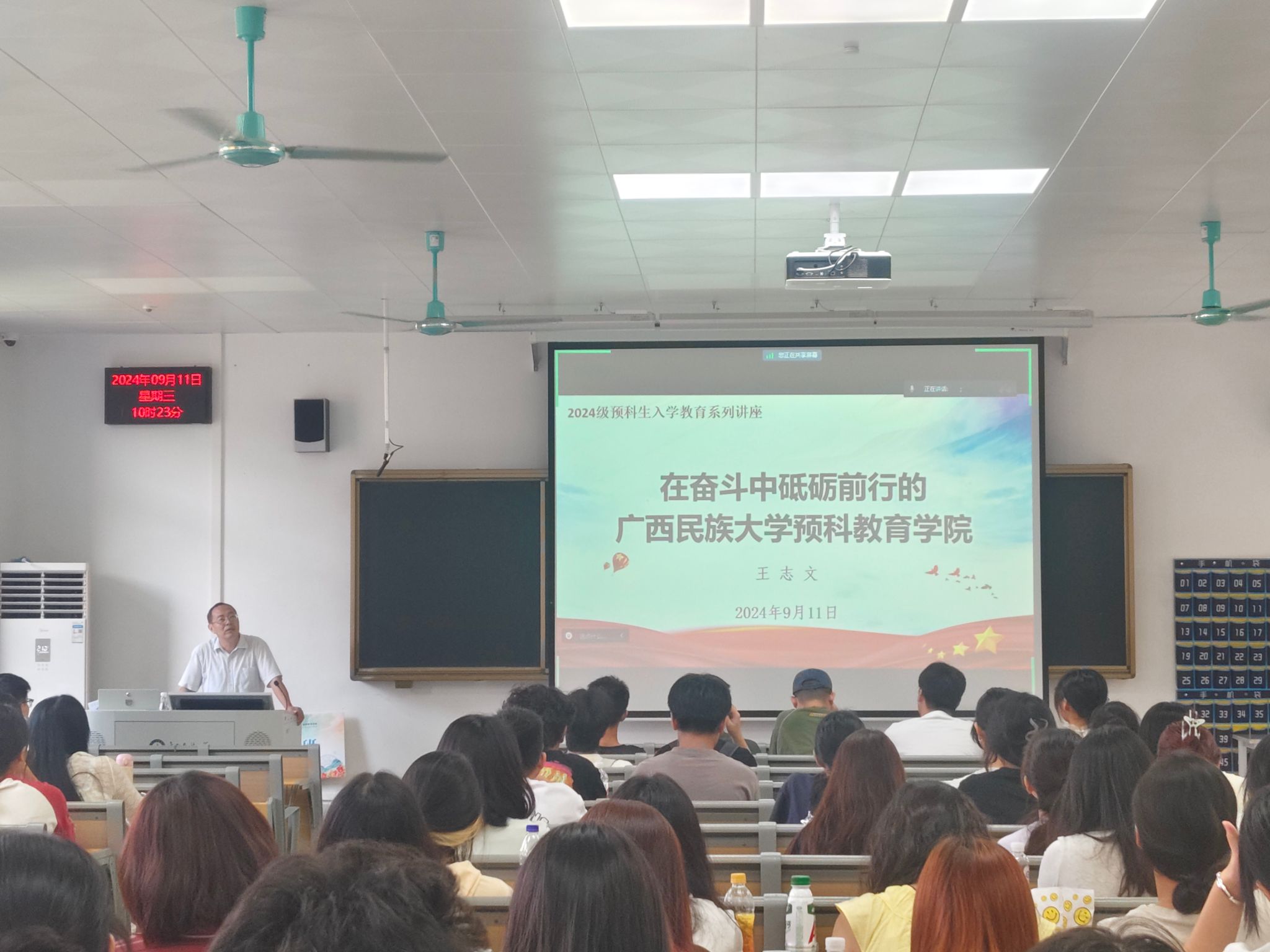 覃锐钧书记为本届新生开展了入党启蒙教育,向同学们讲述了中国共产党的光辉历程和党的基本知识,以及成为一名中国共产党党员的各项要求。在铸牢中华民族共同体意识主题讲座中,覃书记阐述了铸牢中华民族共同体意识的时代背景和现实需要,引导同学们不断增加“五个认同”。王志文院长讲解了学院组织架构、教师组成、办学条件以及课程设置,帮助同学们尽快熟悉预科学习环境。容浒熙副院长向新生们介绍了预科教育的政策性文件、学院的发展历程和取得的各项荣誉。牟永红副院长解读了学业预警和专业直升分流的注意事项,并鼓励同学们以学业为重,为今后能够选择到理想的专业而努力。魏言慈和辅导员们通过系列讲座分别向同学们介绍了综合素质测评考核标准、团委学生会构成情况、考勤与学风建设等教育管理相关内容,帮助同学们更进一步了解各项相关的管理制度。