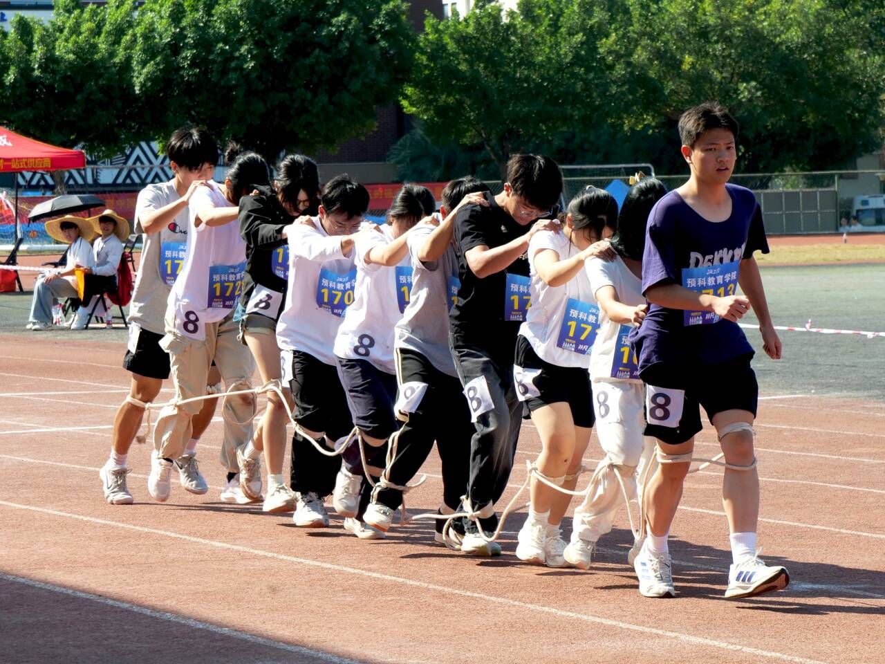 本次运动会共分三天进行,设有田赛、径赛、民族体育比赛和集体项目比赛。在短跑赛事的比拼当中,预科学子们如出弦之箭向终点线迈进,摆臂,跨步,拼尽全力,尽展英姿。“长跑场边千人看,秋日旗下少年狂”漫长的距离,必胜的信念,长跑运动员们迎难而上,勇创佳绩。田径赛场上,参加跳远比赛的运动员们踮脚起跳、收腿,以完美的抛物弧线落地,在沙地处留下成功的足迹。跳高健儿们以腰越杆,面向蓝天,以极具优美姿态完成比赛。铅球赛场上,运动员们将手中的铅球化为一只鸽子, “飞”出完美的抛物线。绣球在运动场空中飞舞,运动员们穿梭于大绳之间,三人板鞋以团结之声踏响于思源湖畔。民族体育比赛项目将民族风情与体育活动融合,尽展民族特色。预科学子们在环校跑、和谐跑、三足接力、协同大转盘、大象拔河、4×400米接力、4×100米接力等集体项目中,通力合作,团结一心,向我们展现出了同学们坚毅的信念和团结的精神。