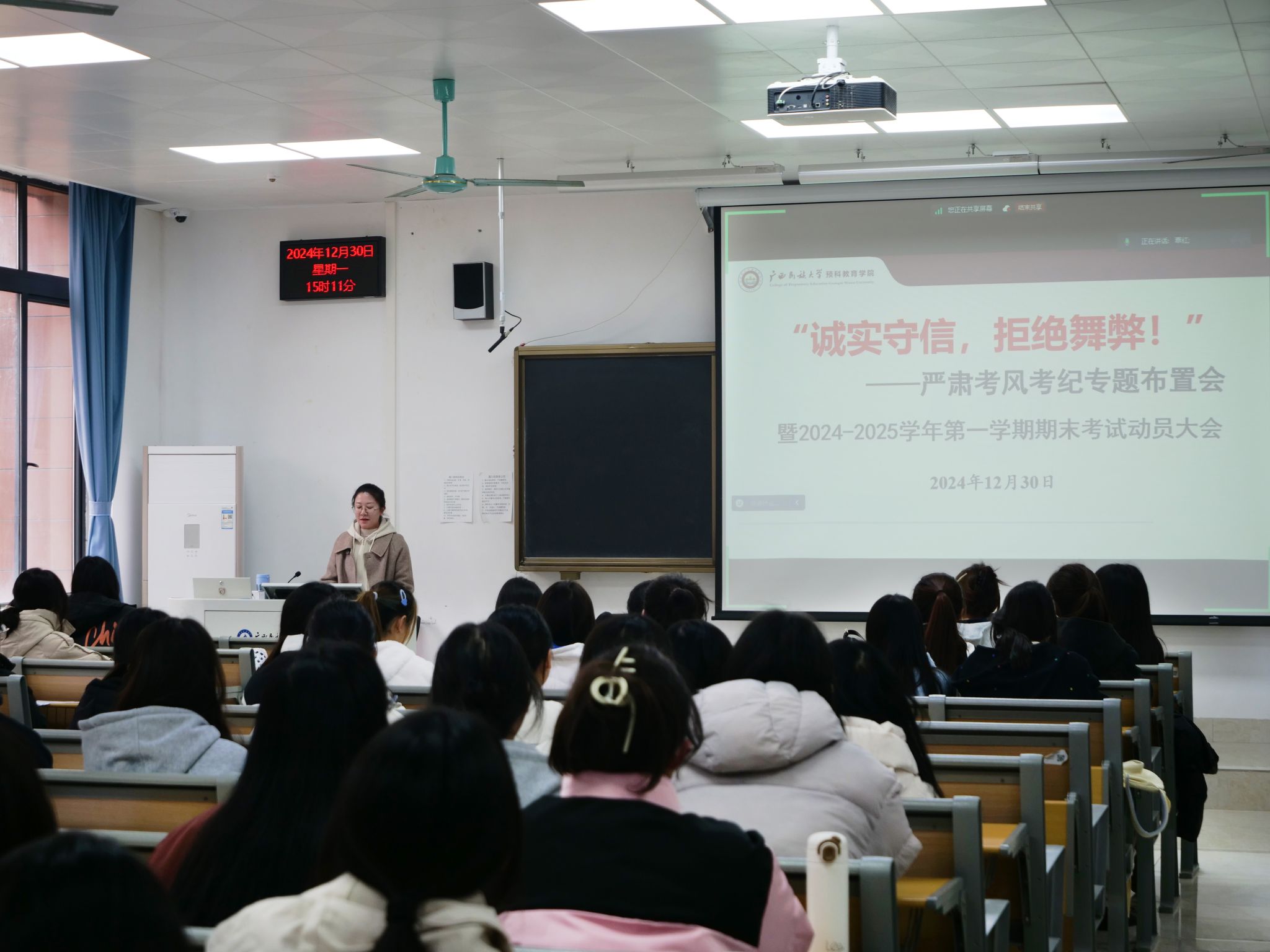 12月30日,beats365亚洲版在2号教学楼301教室开展“规范考试行为,共筑诚信考风”期末诚信考试动员大会。大会由学院教学秘书甘昆玉,专职辅导员邓颖颍主讲,全体预科生参与。