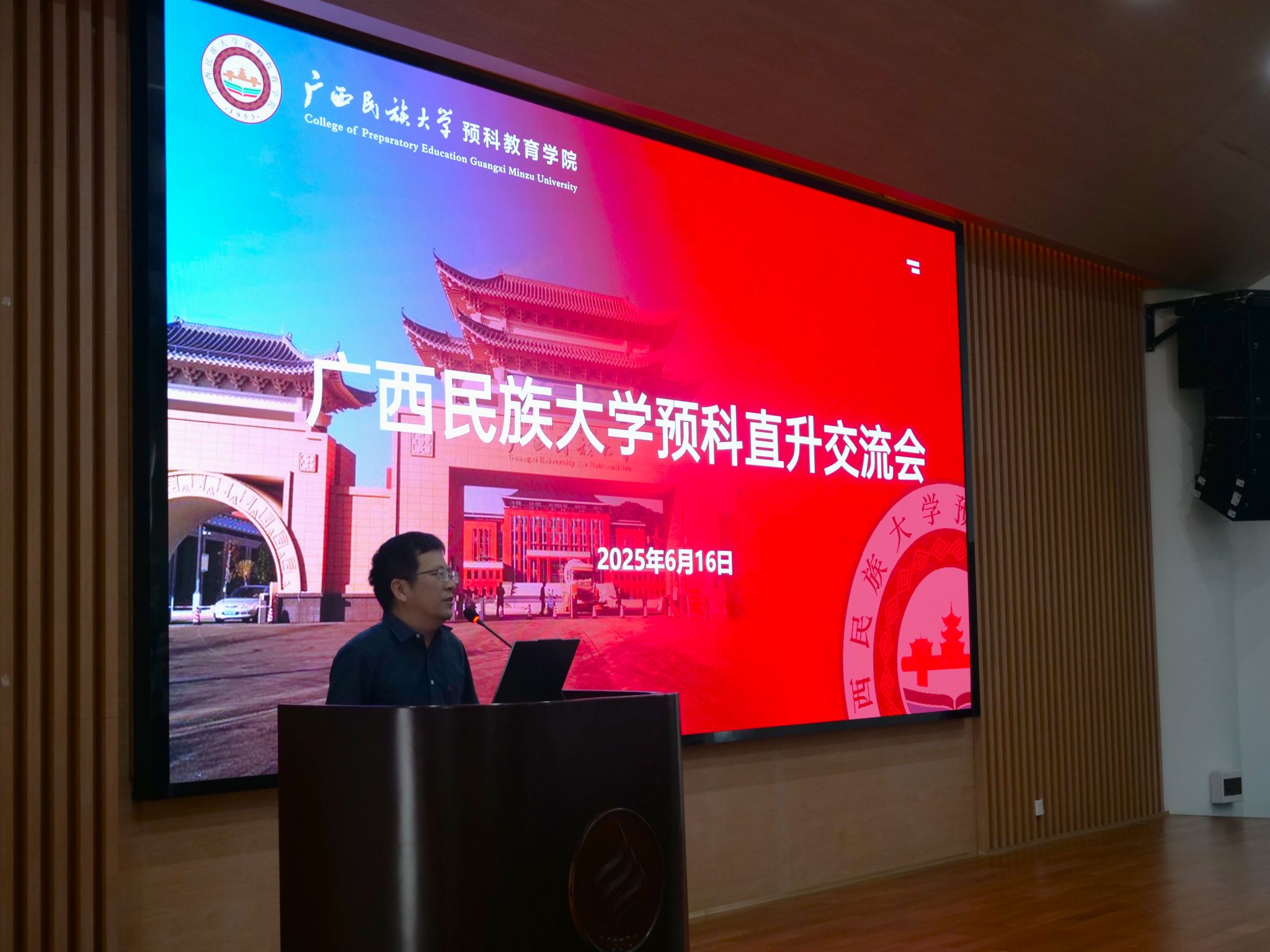 近日,我院召开2025届少数民族预科班学生直升本科交流会。广西民族大学招生就业处副处长余高和陈锡波老师,南宁师范大学招生就业处处长闫位荣和梁莹老师参加会议。