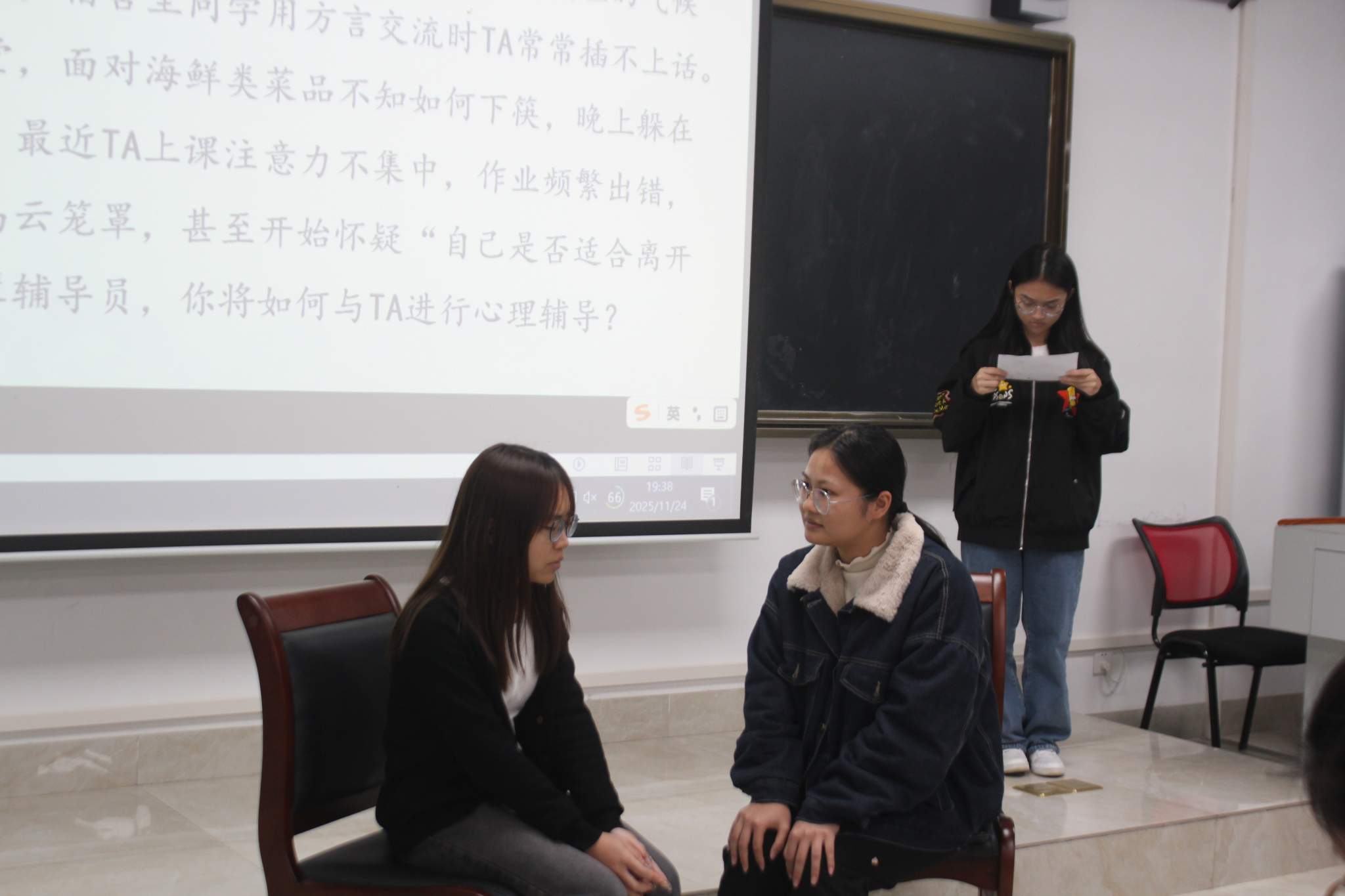初赛采取线上笔试形式,通过学习通平台进行,内容涵盖一百道心理知识题目。考试过程中,考场秩序良好,参赛队员沉着答题,展现出扎实的知识基础与良好的心理素质。初赛成绩按团队总分计算,前十名队伍进入复赛。复赛采用情景模拟方式,各队随机抽取辅导案例,由一名队员进行现场模拟,另两名队员进行分析总结。参赛选手配合默契、应对灵活,体现了良好的团队协作与心理辅导能力。