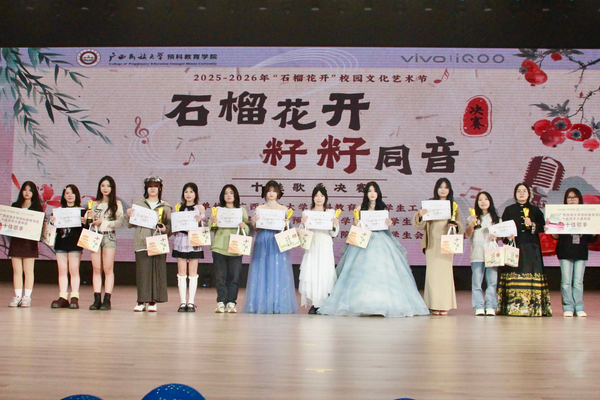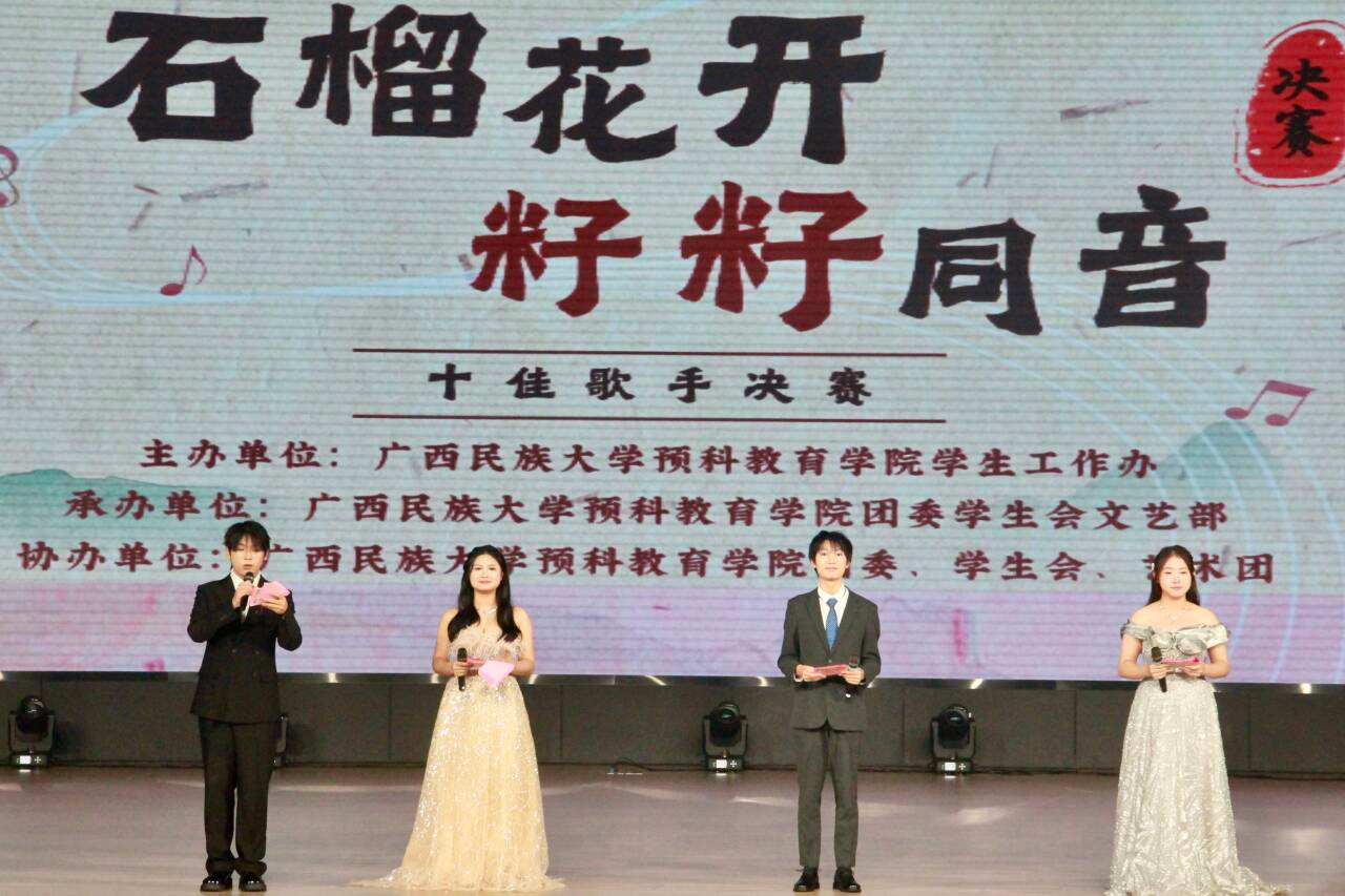 12月12日,beats365亚洲版2025年“石榴花开,籽籽同音”十佳歌手大赛决赛在武鸣校区大礼堂顺利举行。经过前期的选拔,共有十四名选手晋级决赛,最终十名选手凭借优异的表现荣获“十佳歌手”称号。其中,文科一班的骆芜芳歌同学凭借出色表现摘得桂冠,潘柏芝、王婧懿同学分别获亚军、季军。
